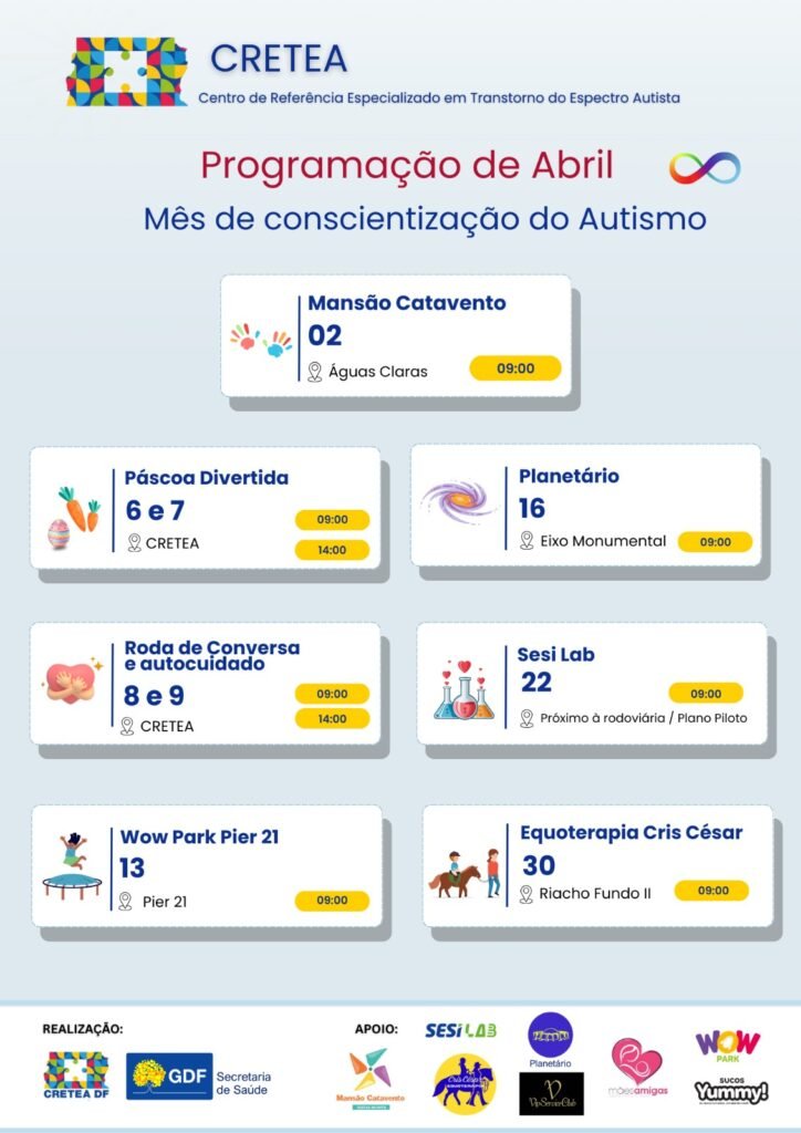 Entre outras ações previstas, estão as visitas ao Planetário de Brasília, no dia 16 de abril, e um evento de equoterapia recreativa, no dia 30. A programação completa pode ser conferida no banner abaixo: